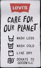 Levi Strauss has also introduced their “Care Tag For Our Planet” campaign. Given that 45% of the 919 gallons consumed during the lifetime of a pair of jeans is the result of consumers’ washing their jeans, Levi’s is promoting we wash our jeans less, use cold water when we do wash them, line dry instead of using a dryer, and donate our unwanted jeans to lessen the number of jeans finding their way into our landfills.